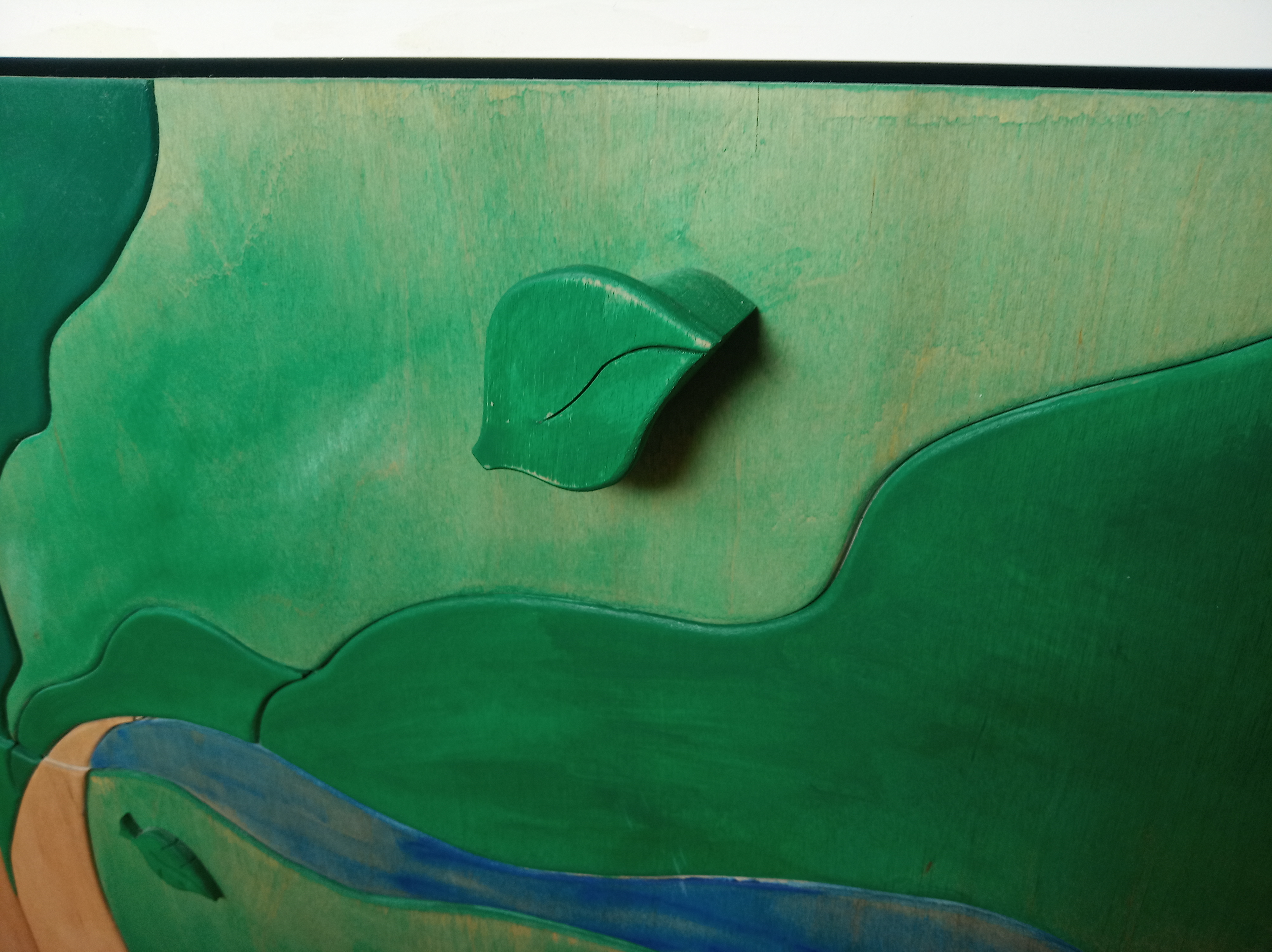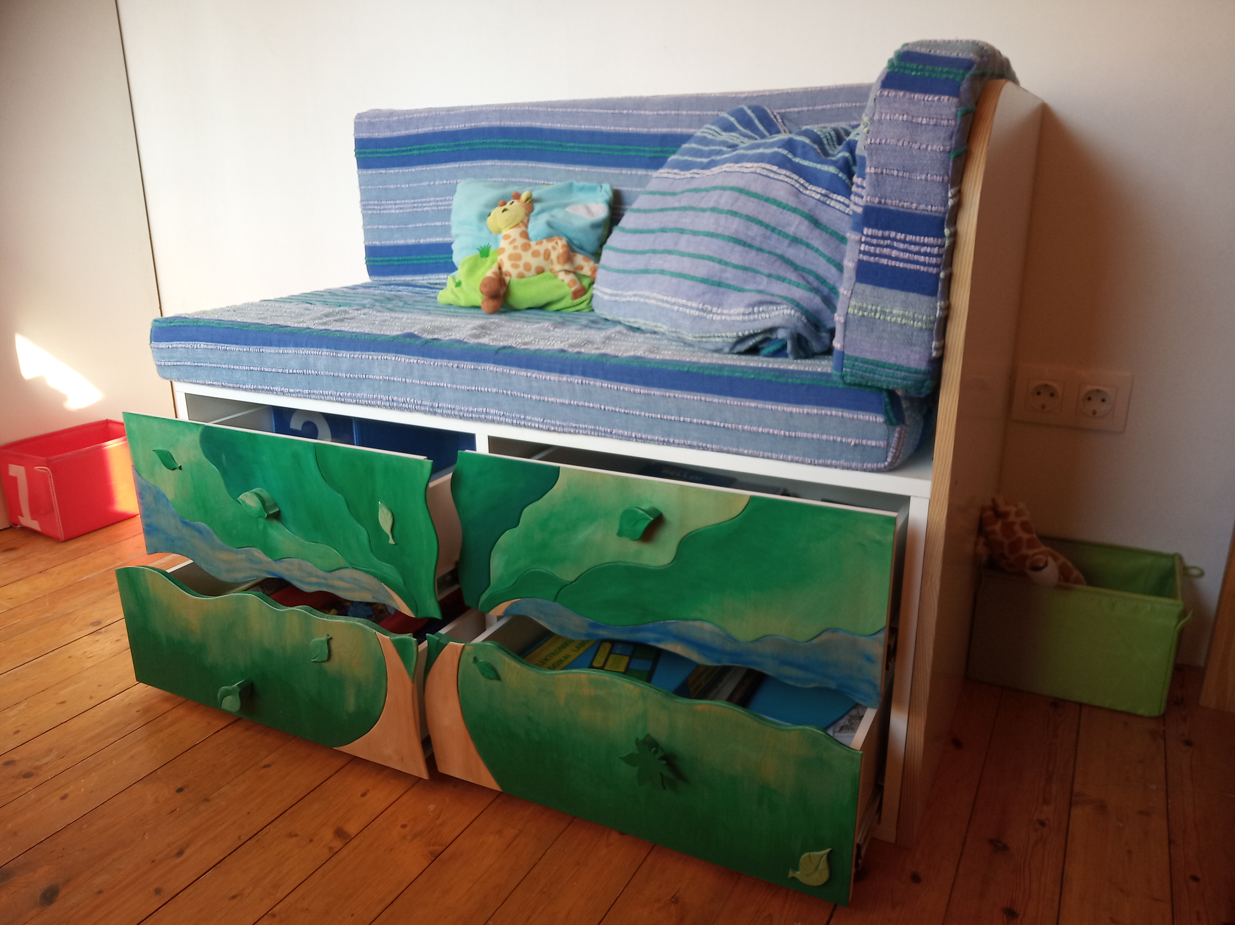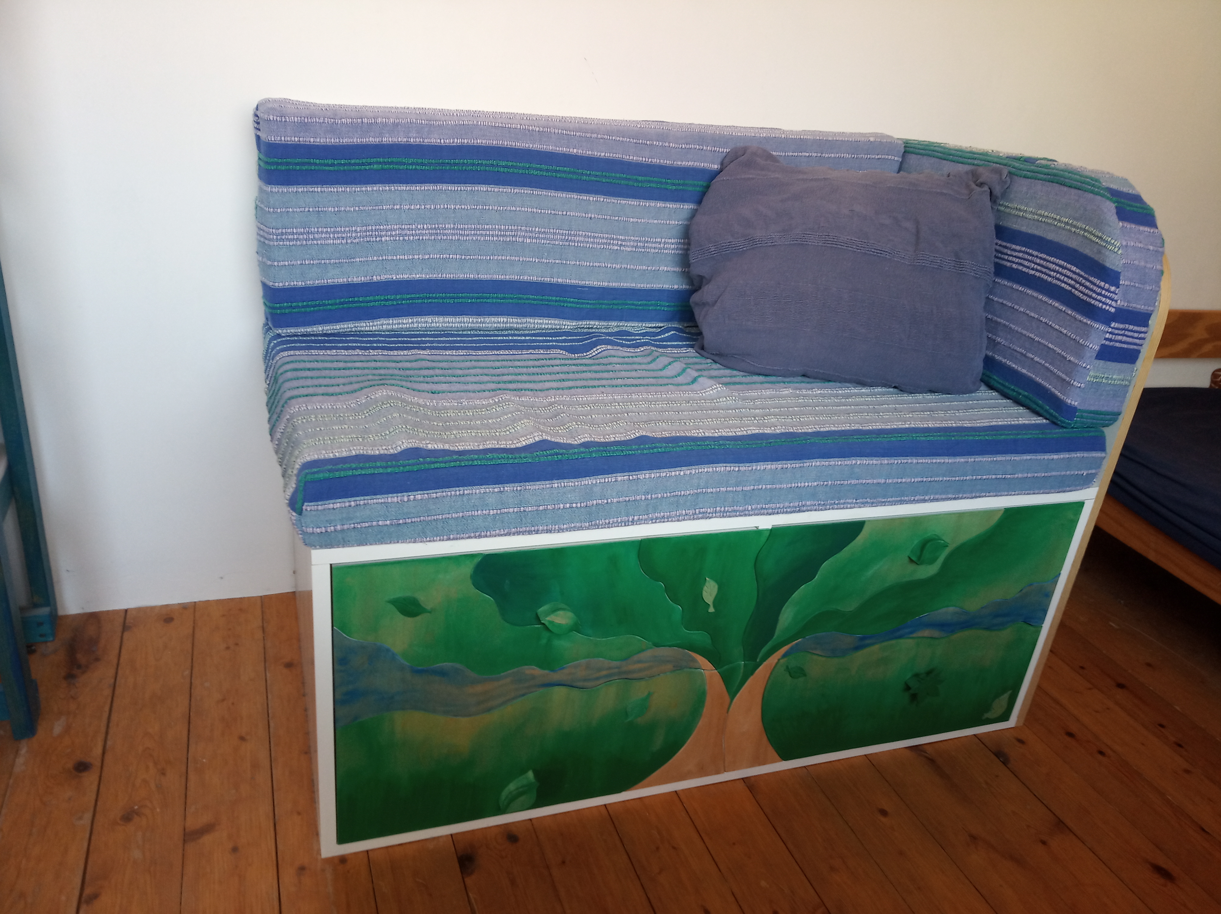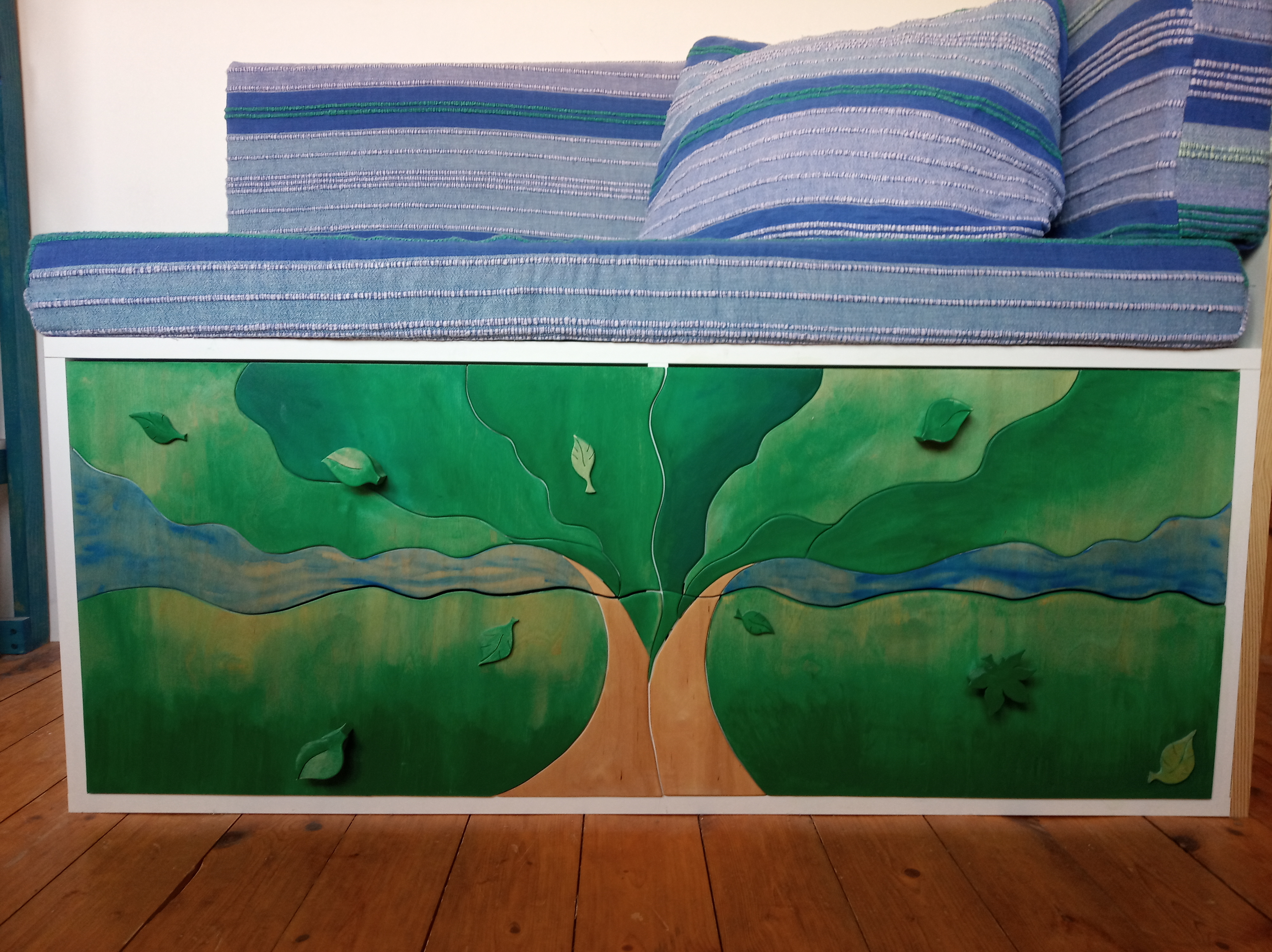 A felső része egy ülő,- heverészőalkalmatosság, mely minden szobában hasznos lehet, míg alul egy fiókos tárolóegység található, három dimenziós intarziával a fiókok előlapjain.