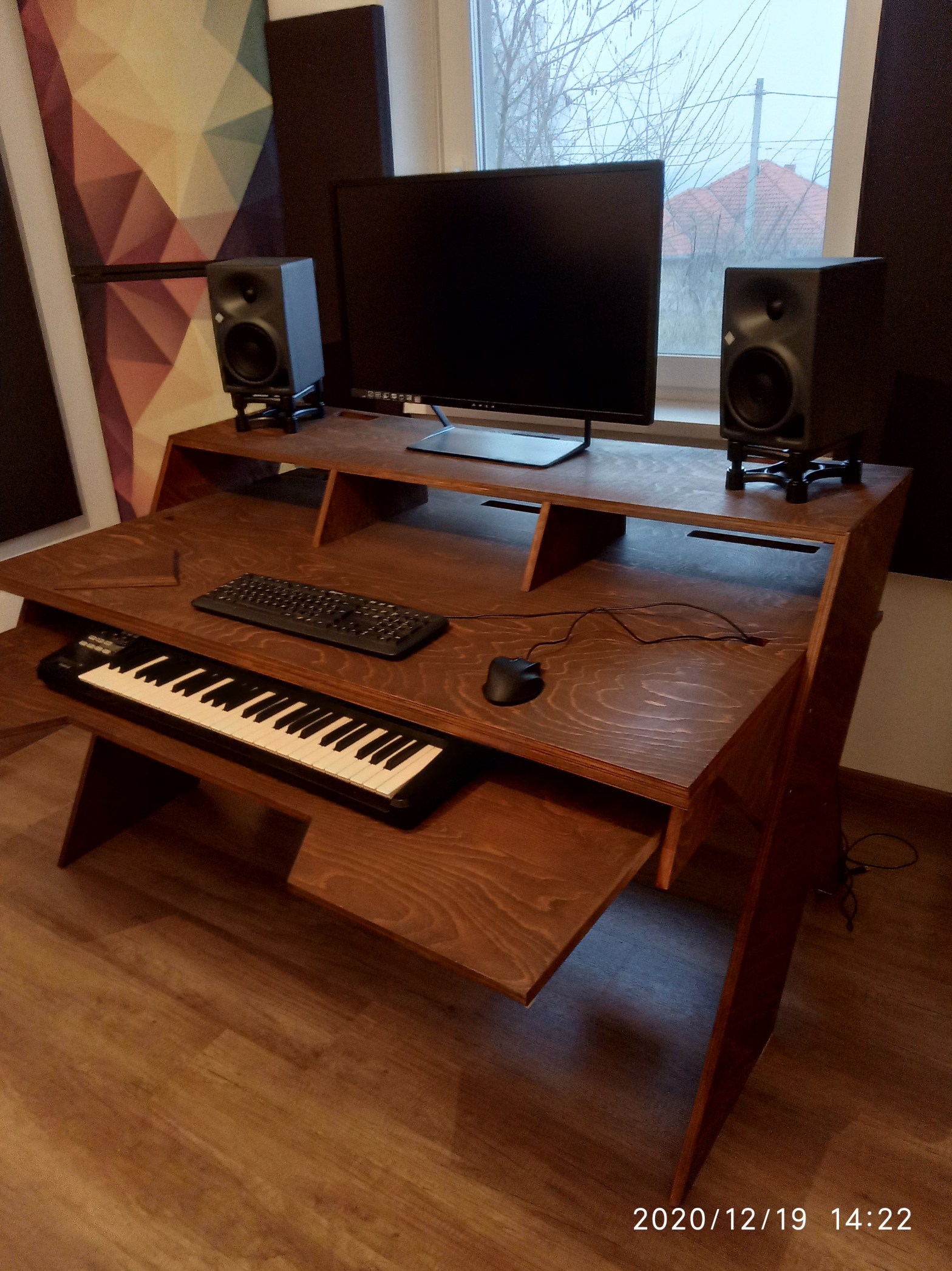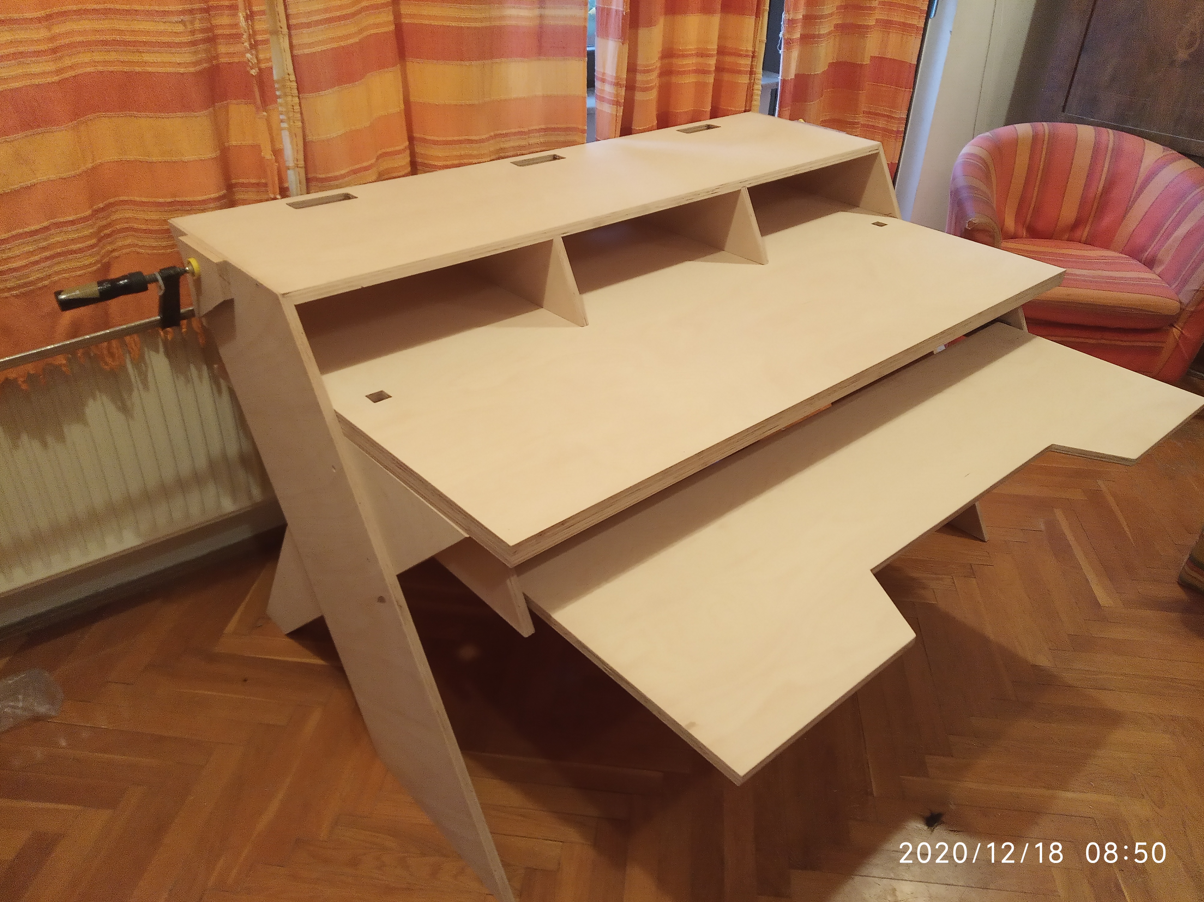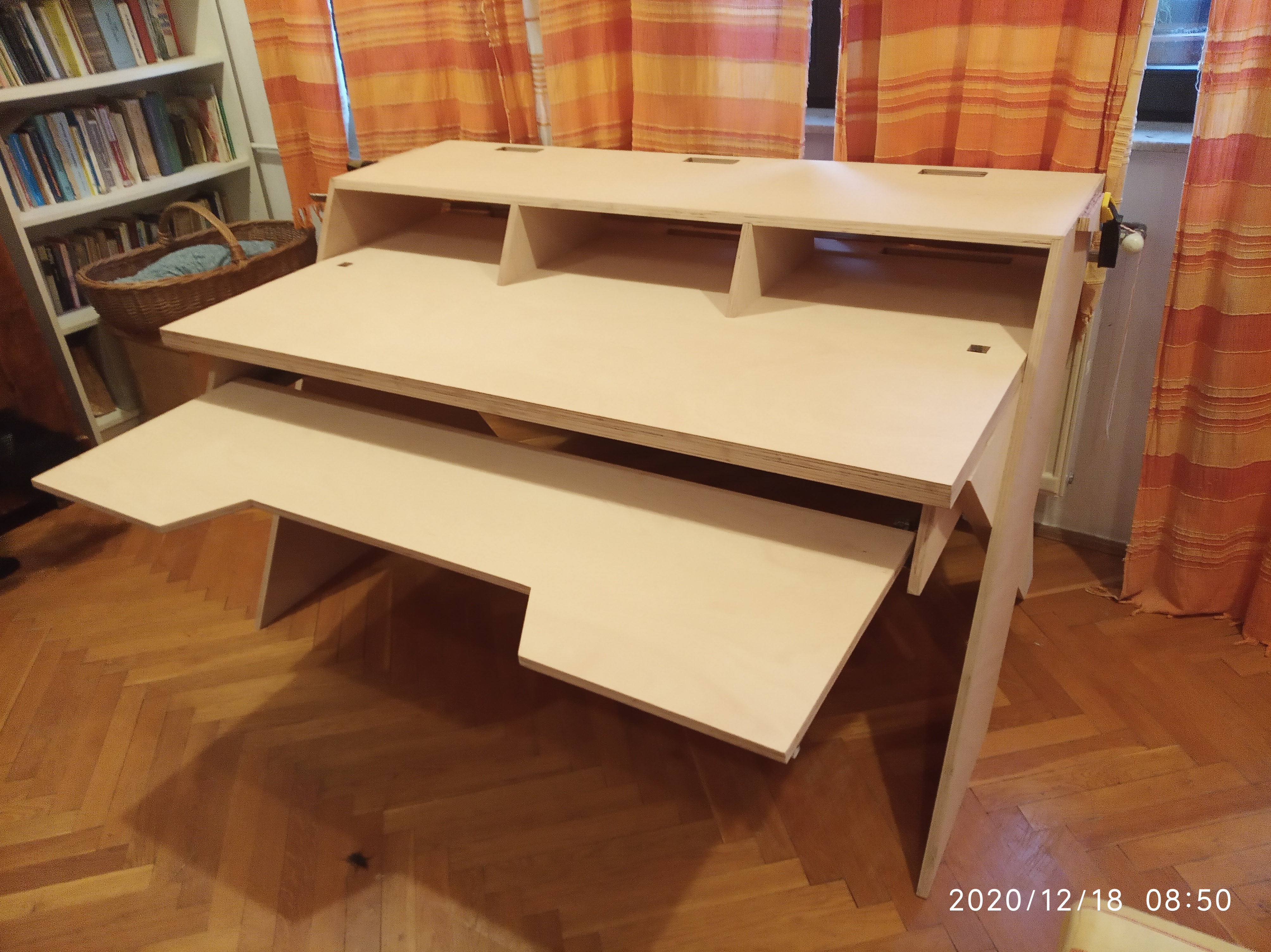 Bükk rétegelt lemezből, diószínű olajozással készült ez a méretes (1,5 méter széles, majd’ egy méter mély) X lábú asztal, kihúzható billentyűzettartóval.