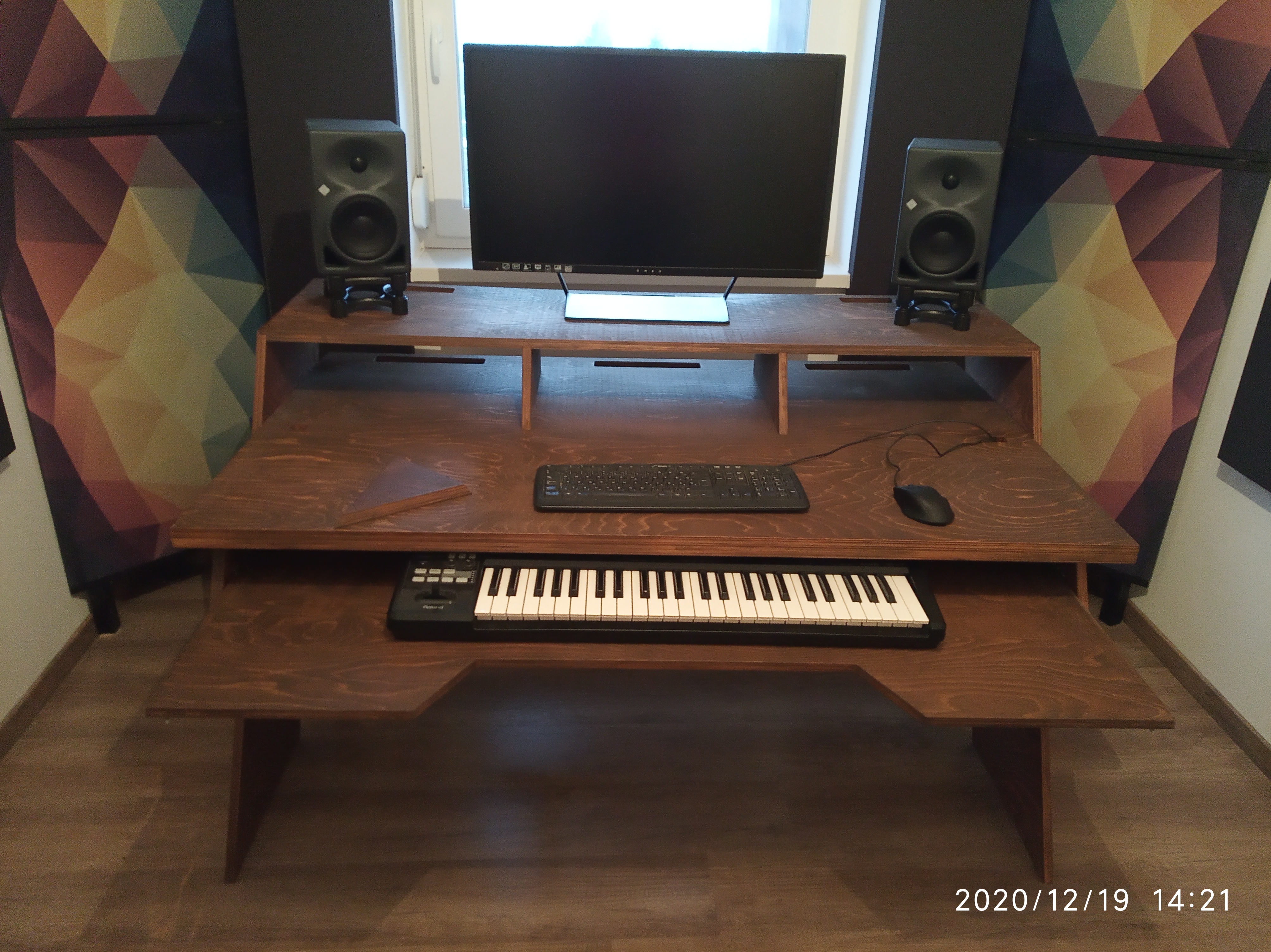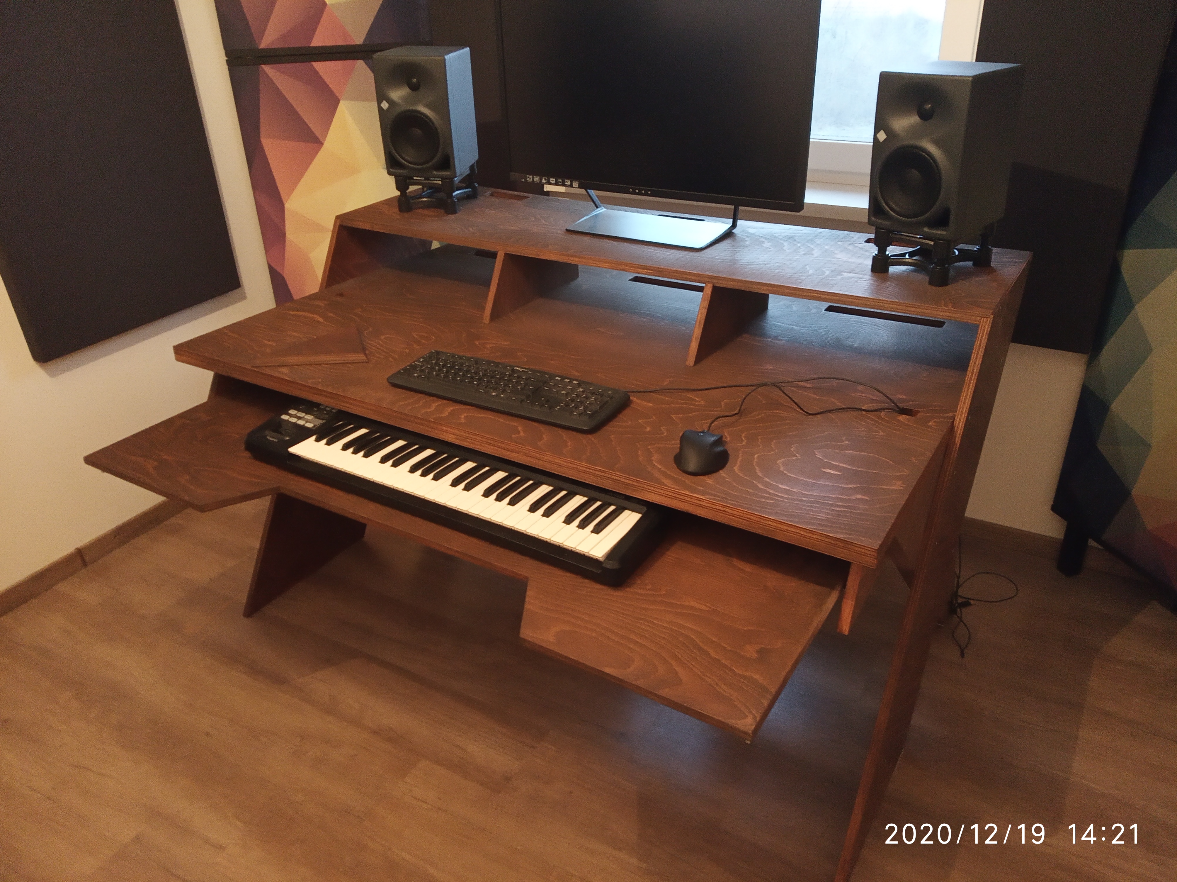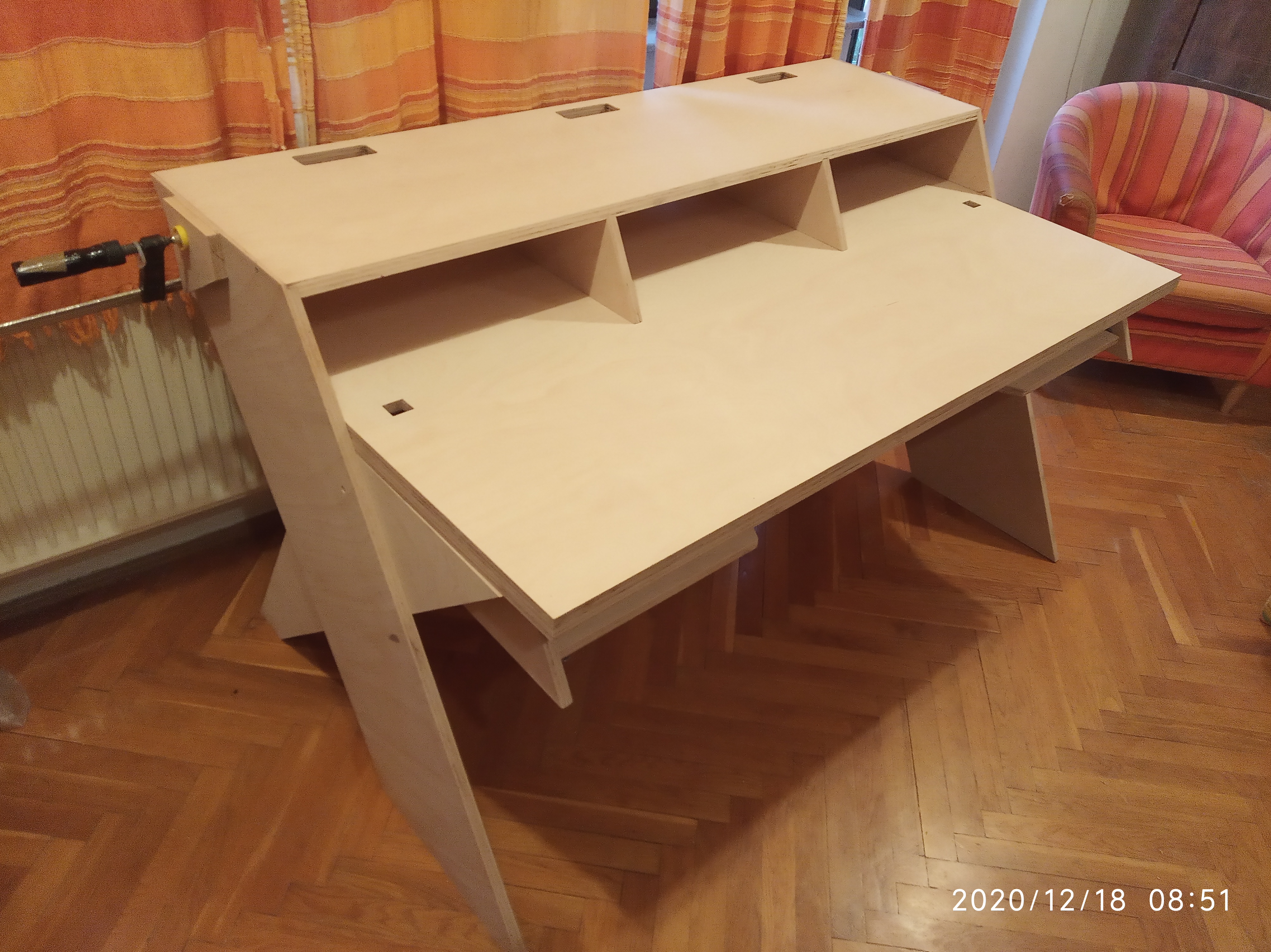 Bükk rétegelt lemezből, diószínű olajozással készült ez a méretes (1,5 méter széles, majd’ egy méter mély) X lábú asztal, kihúzható billentyűzettartóval.