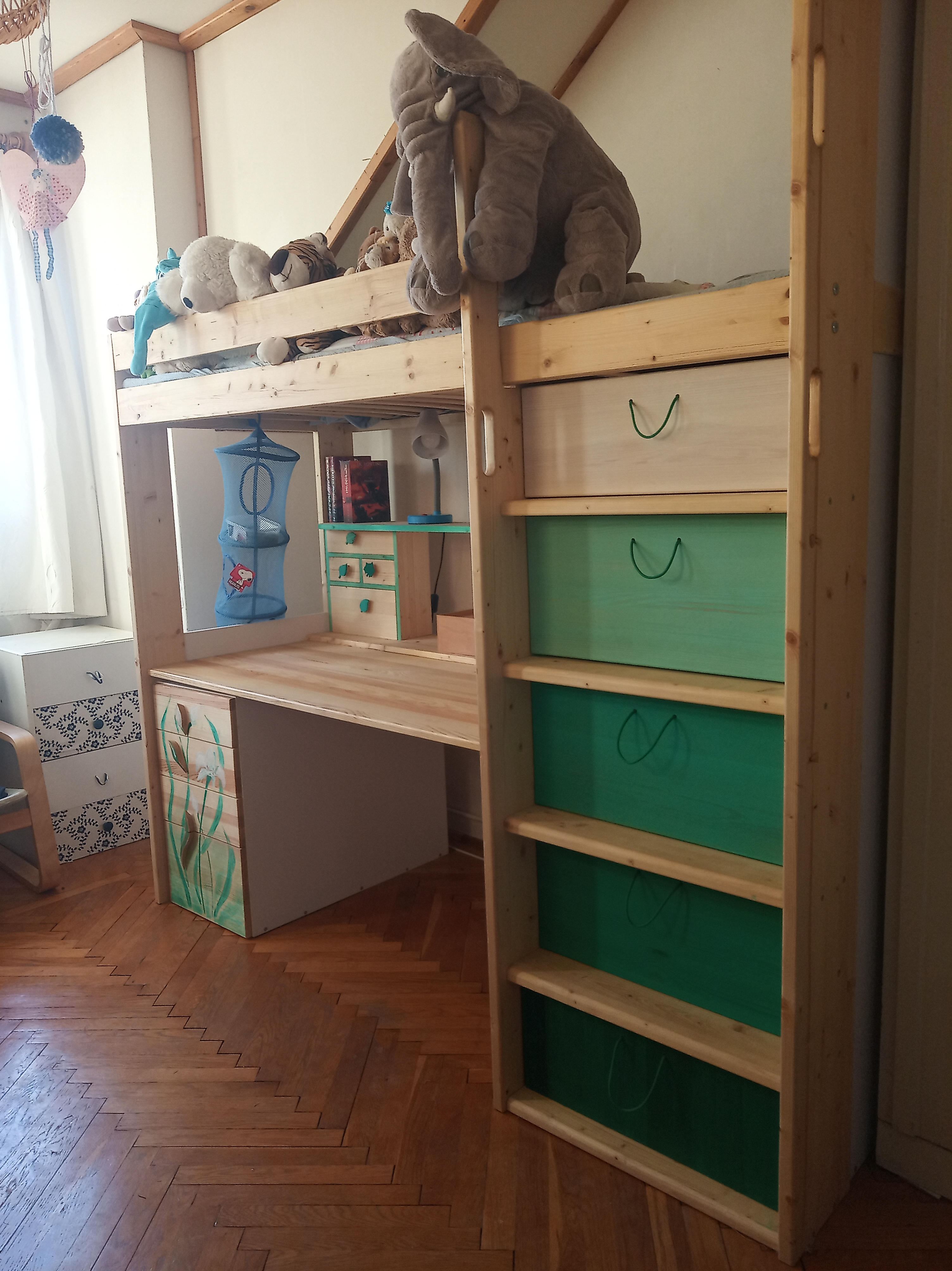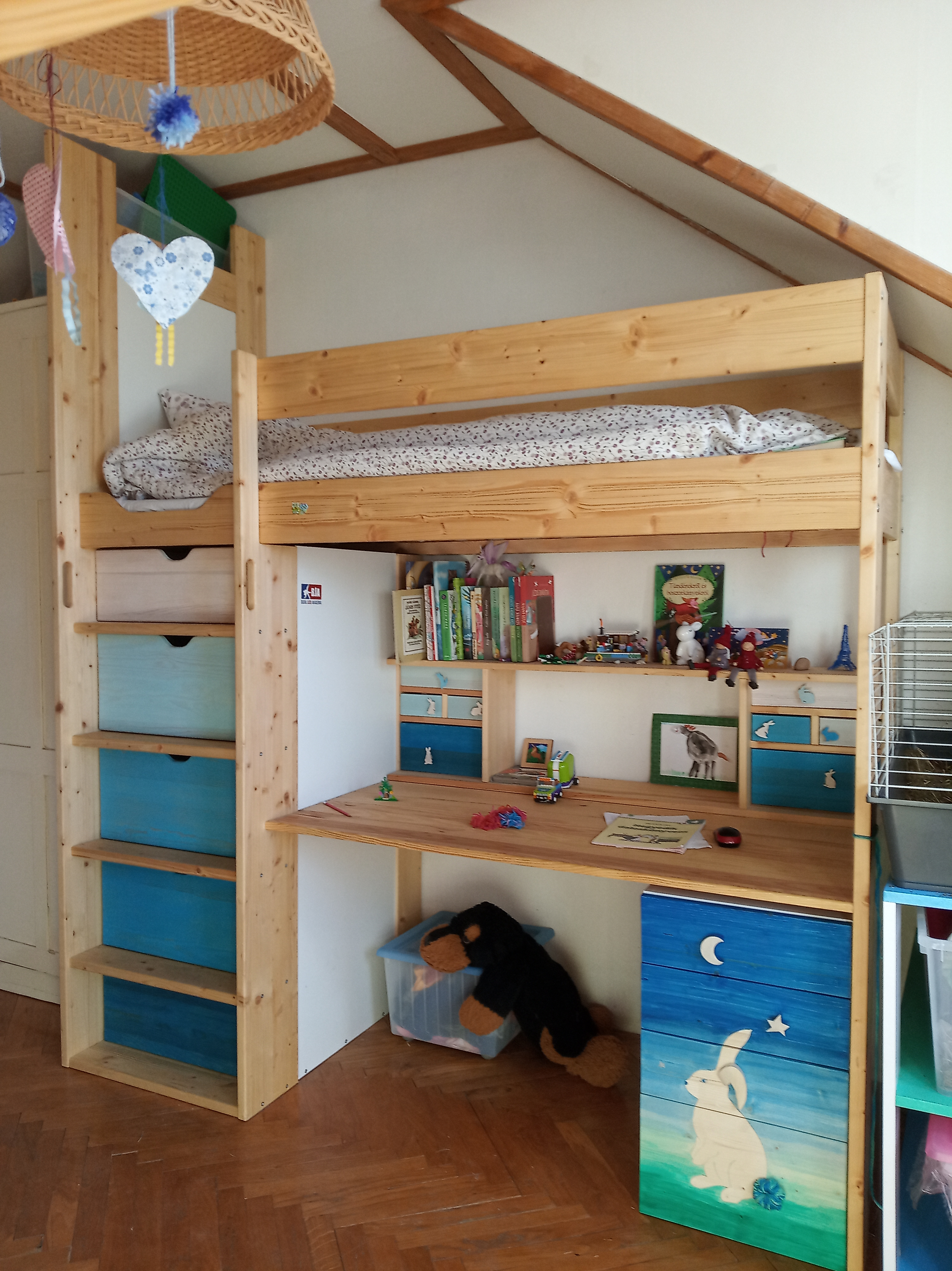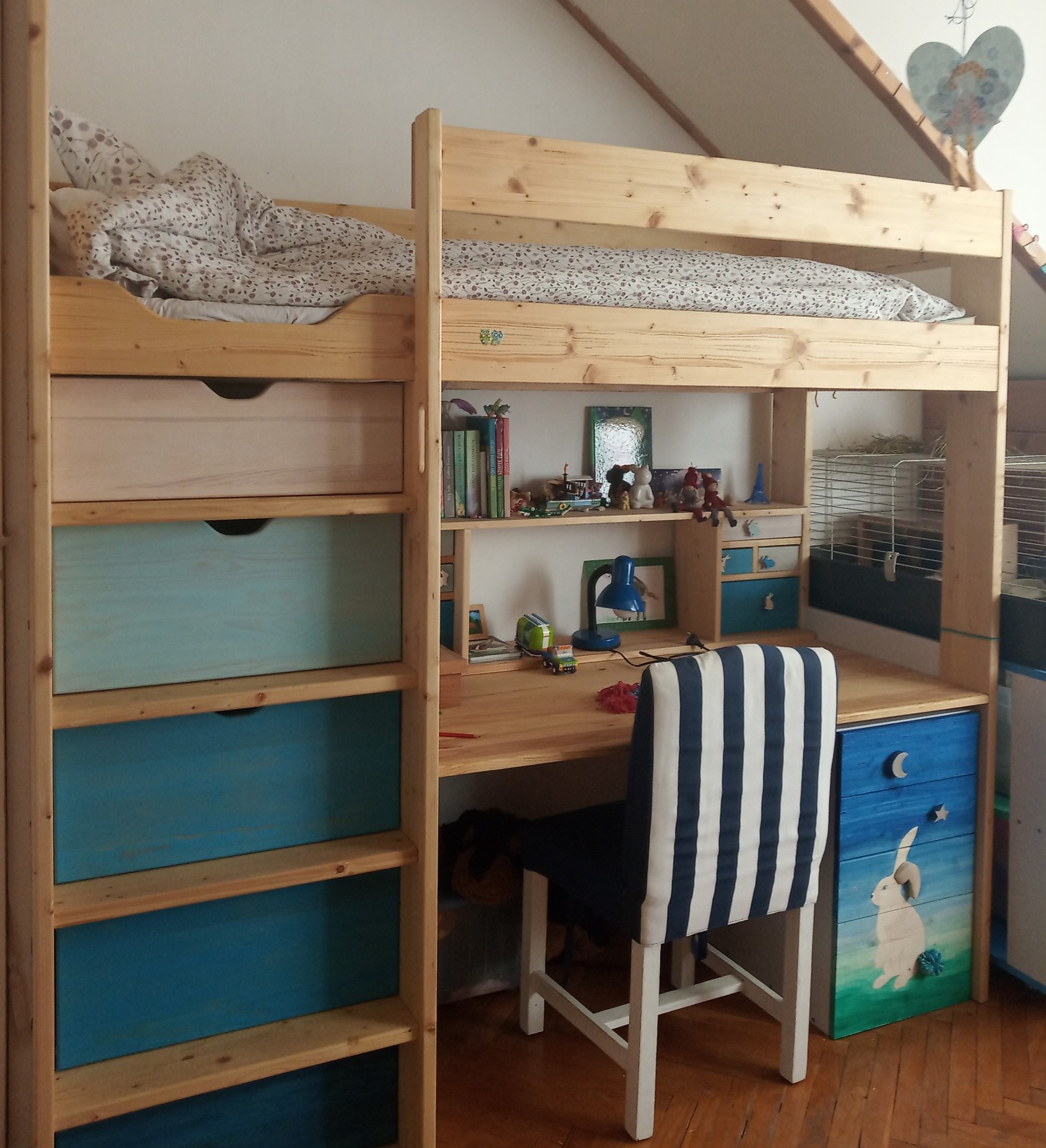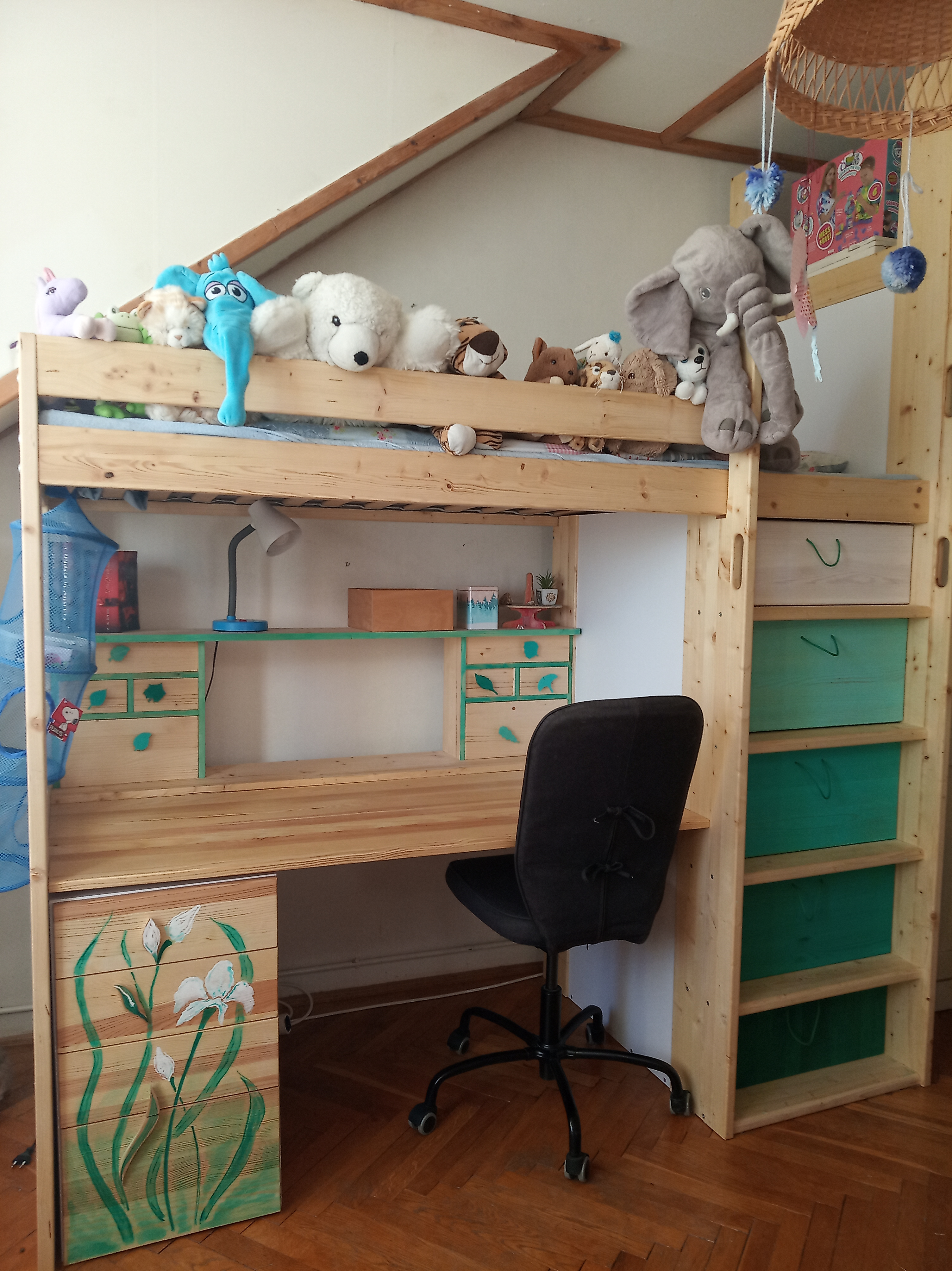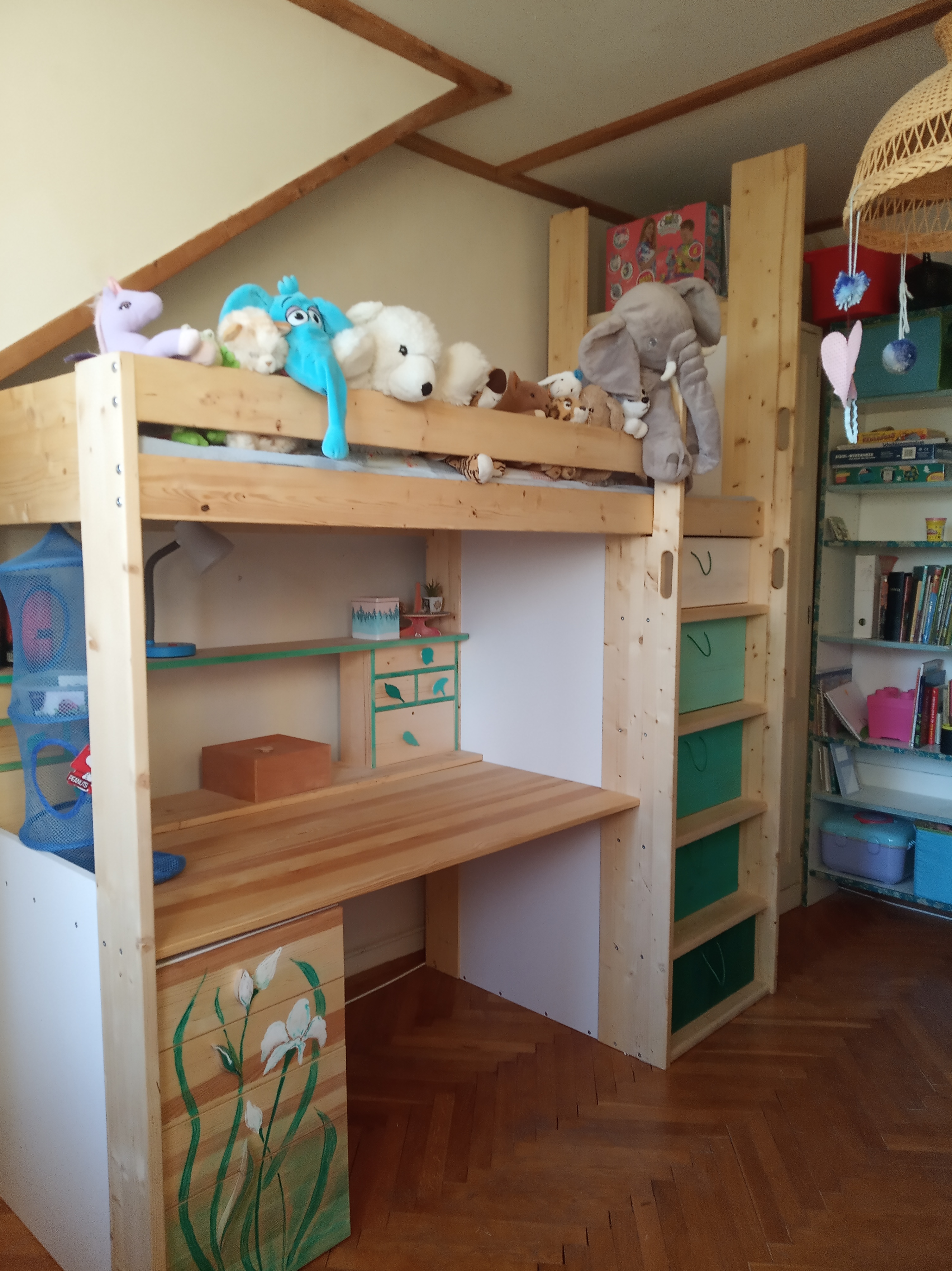 Ha rövid a kardod… akarom mondani, ha kicsi a helyed, toldd meg egy szinttel. Felül ágy, alul asztal, a kettő közt a lajtorja pedig teljesen saját fejlesztés, a fokok mögött rejtőző, hatalmas mennyiségű holmit elnyelő, 70 cm mély fiókokkal. A fölső kettő speciális kialakítású, igazából nem is fiók, hanem kihúzható polc, hogy a tulajdonosok hozzáférjenek a tartalmához (ha a nagyfiaimnak csináltam volna, elég lenne a hagyományos fiók, de a célközönség még nem haladta meg a 180 centit 😊 )