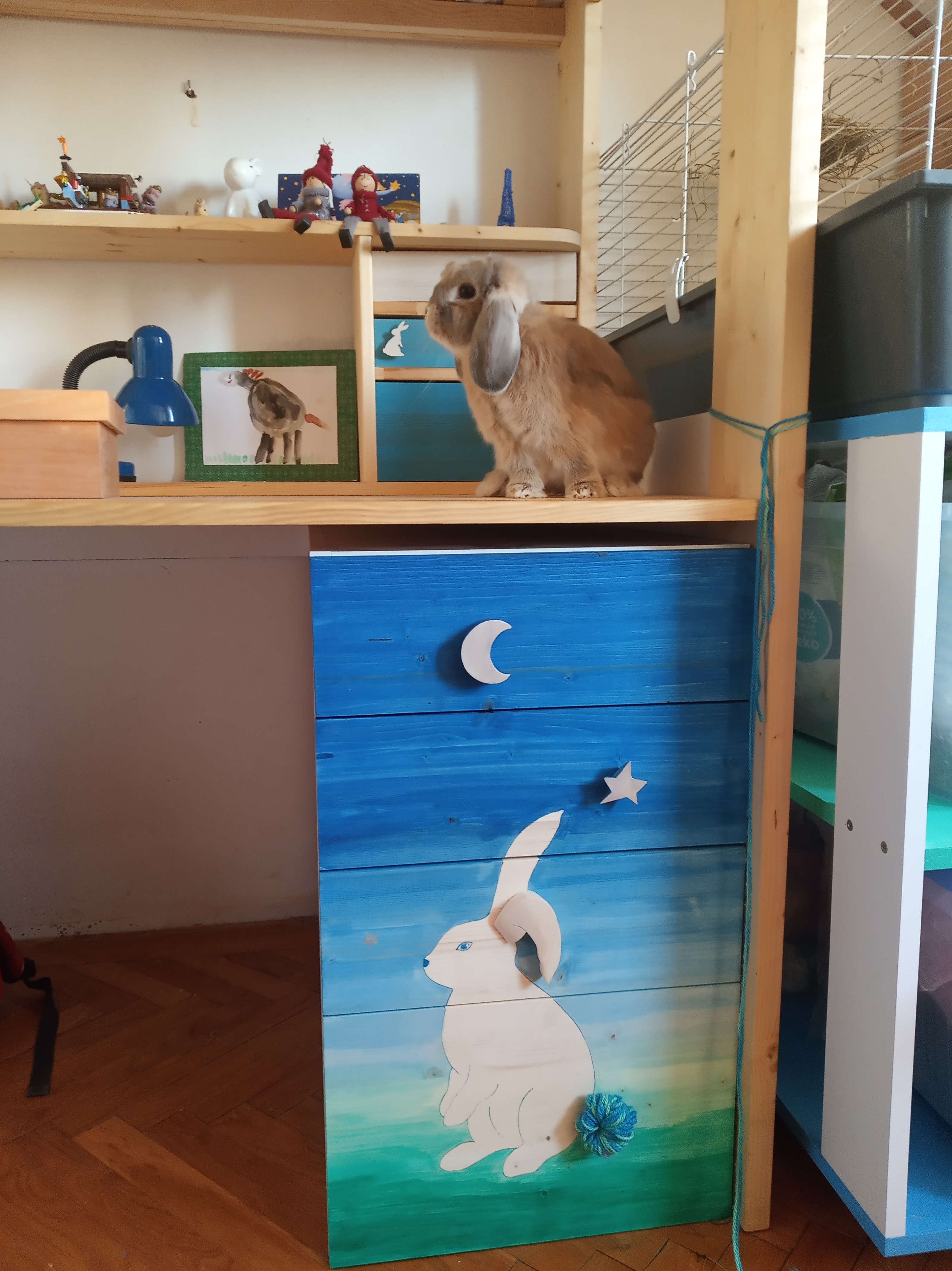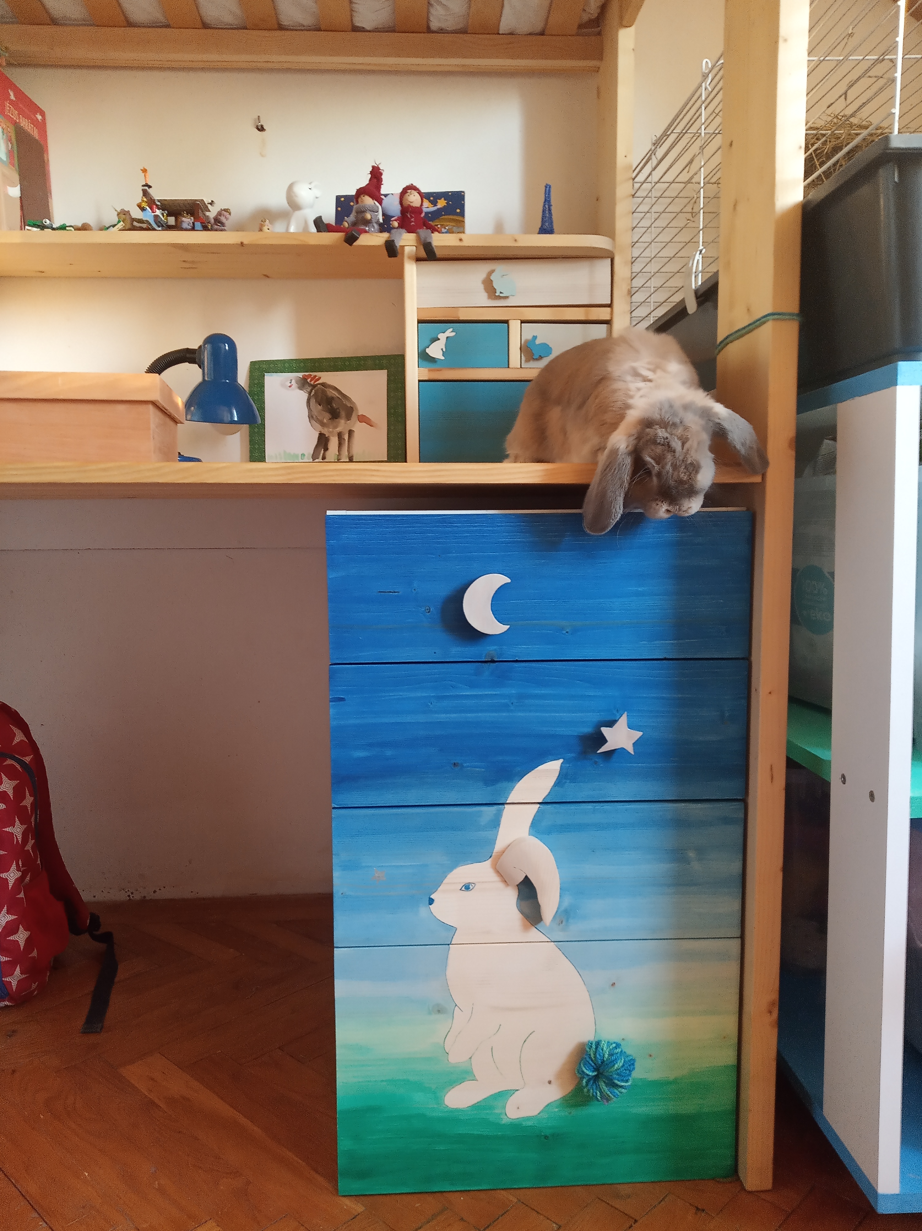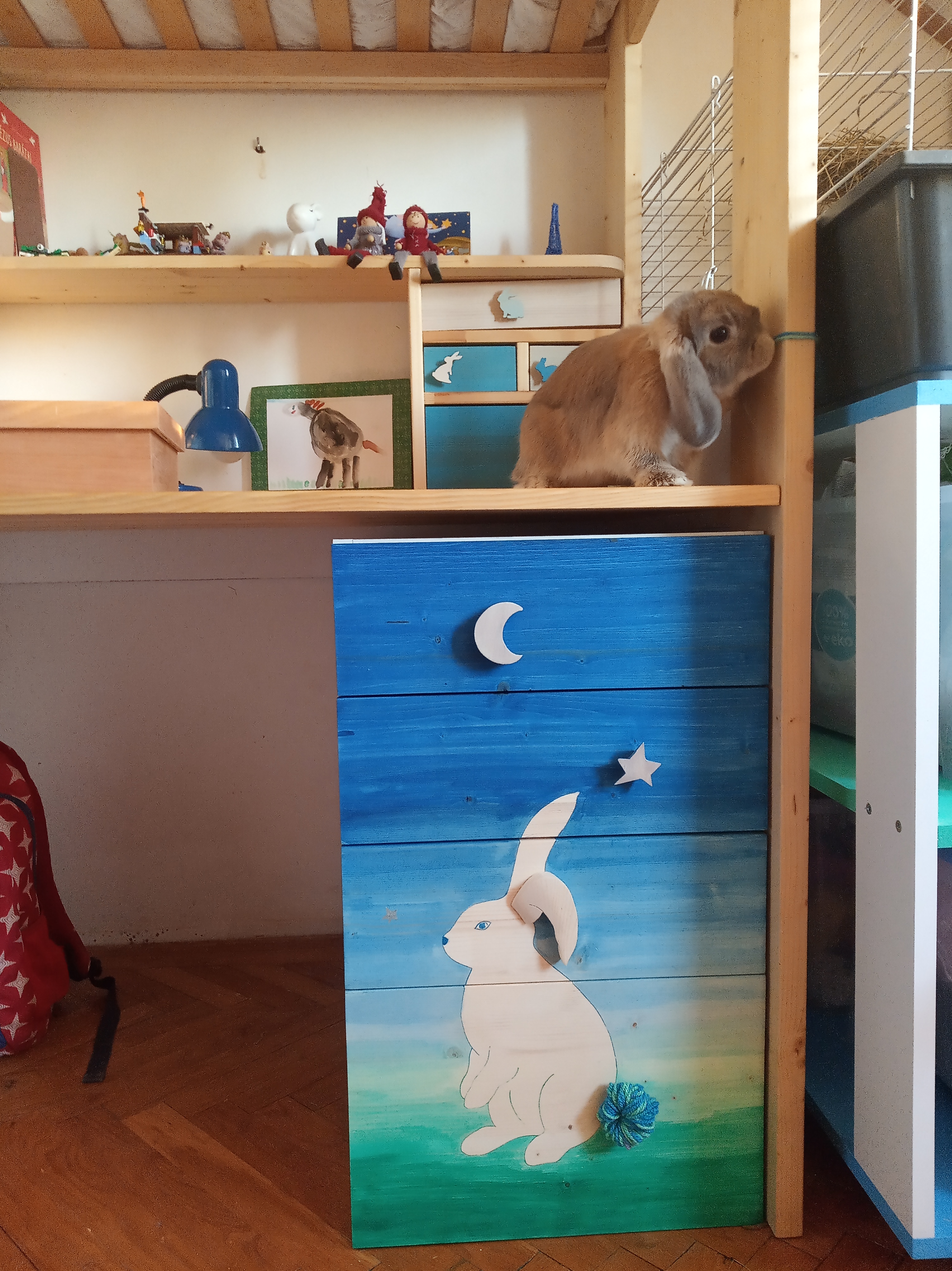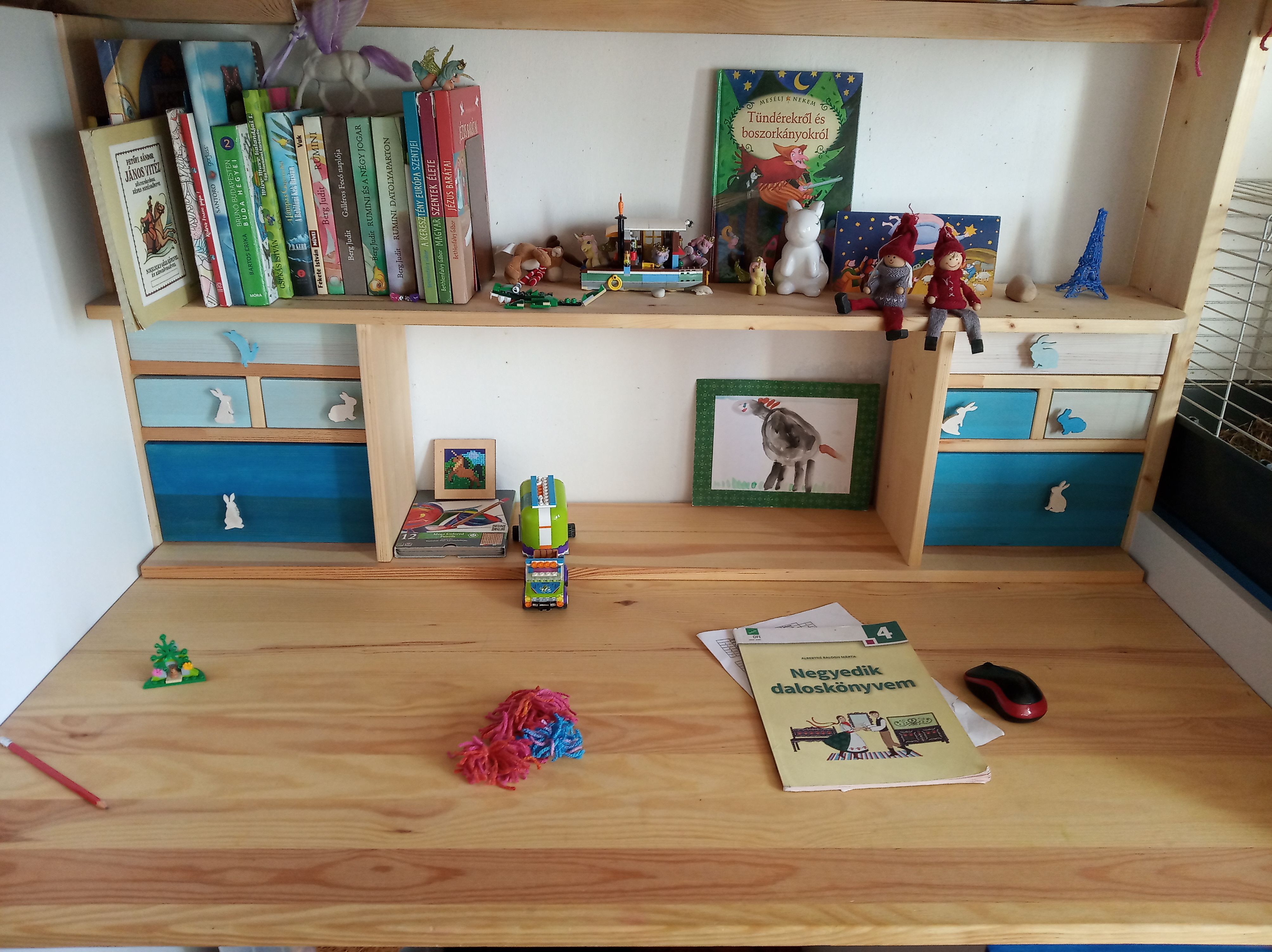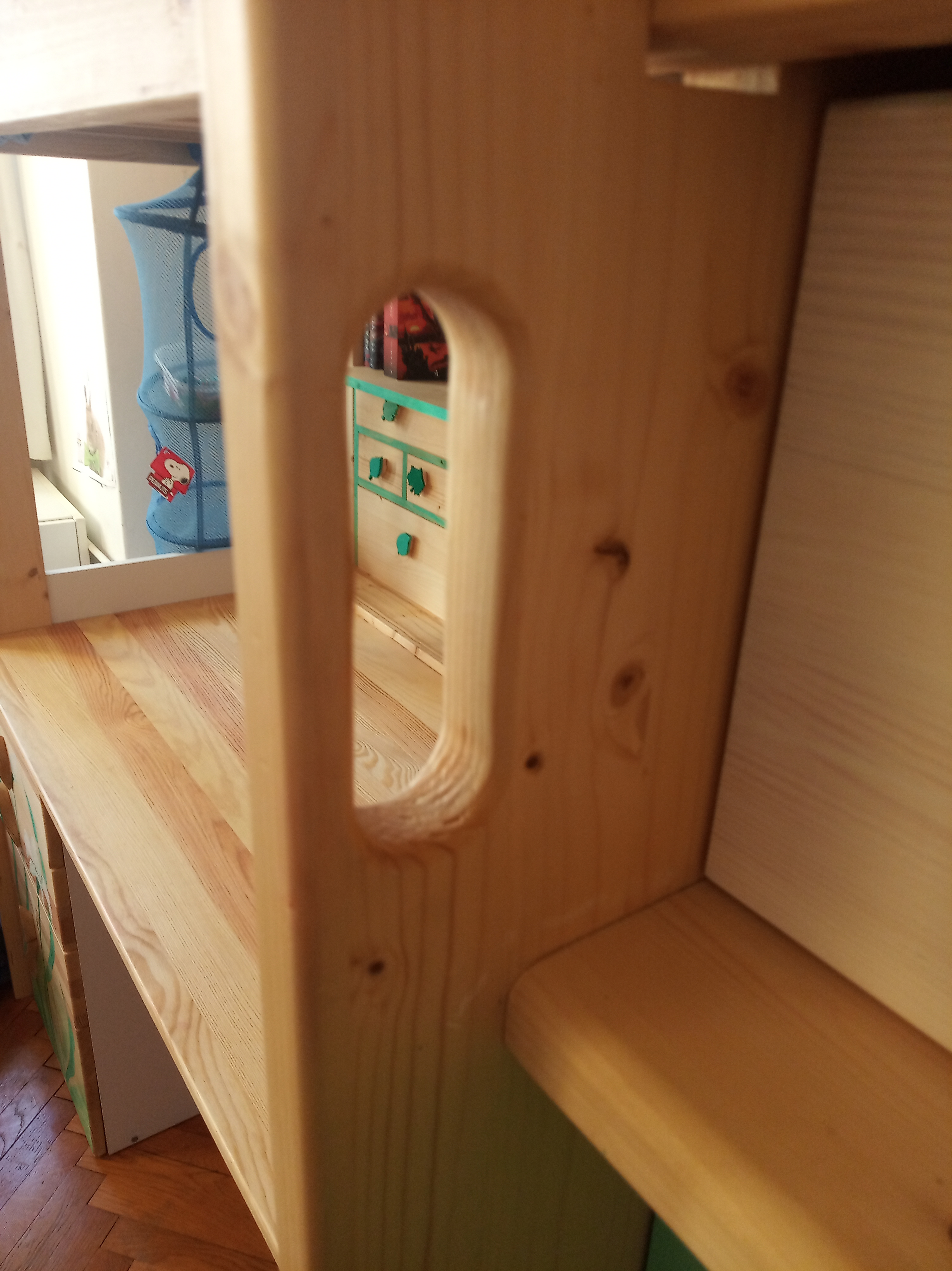 Ha rövid a kardod… akarom mondani, ha kicsi a helyed, toldd meg egy szinttel. Felül ágy, alul asztal, a kettő közt a lajtorja pedig teljesen saját fejlesztés, a fokok mögött rejtőző, hatalmas mennyiségű holmit elnyelő, 70 cm mély fiókokkal. A fölső kettő speciális kialakítású, igazából nem is fiók, hanem kihúzható polc, hogy a tulajdonosok hozzáférjenek a tartalmához (ha a nagyfiaimnak csináltam volna, elég lenne a hagyományos fiók, de a célközönség még nem haladta meg a 180 centit 😊 )