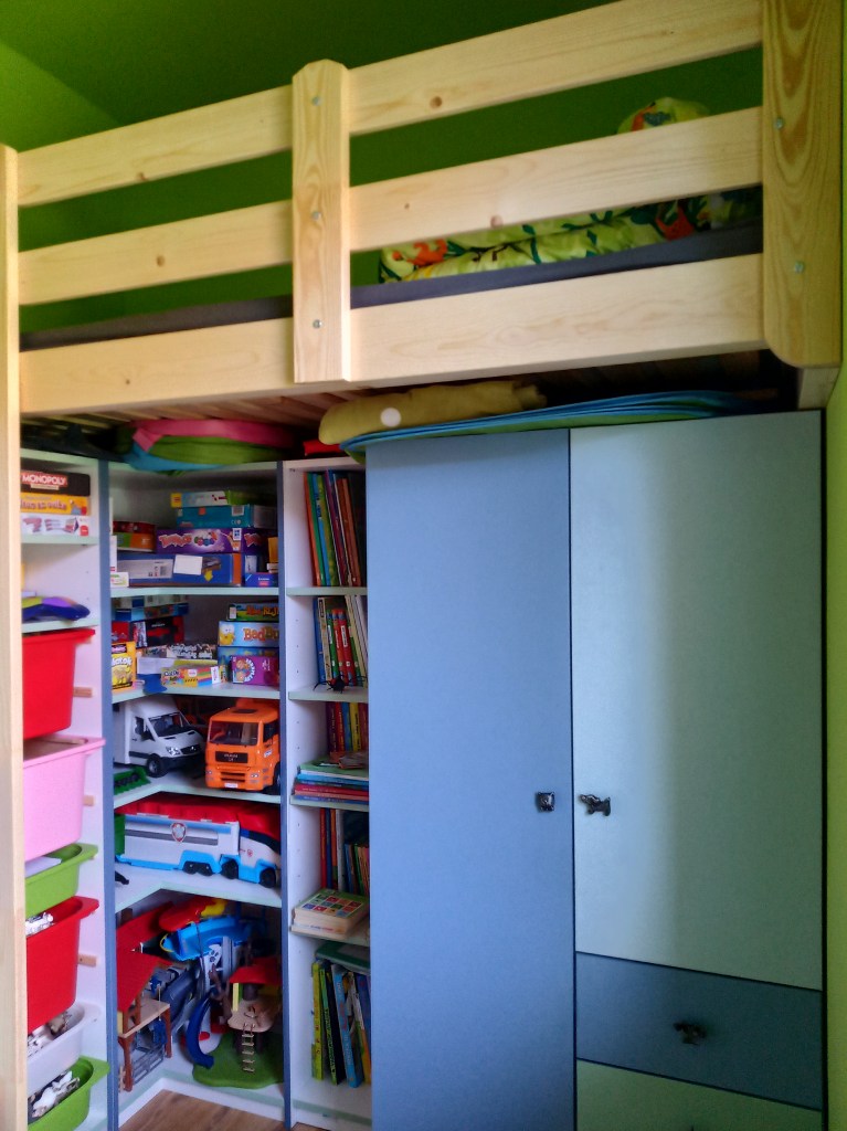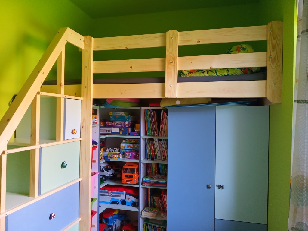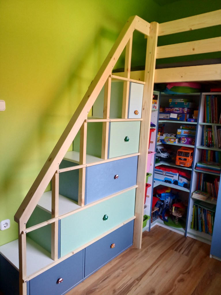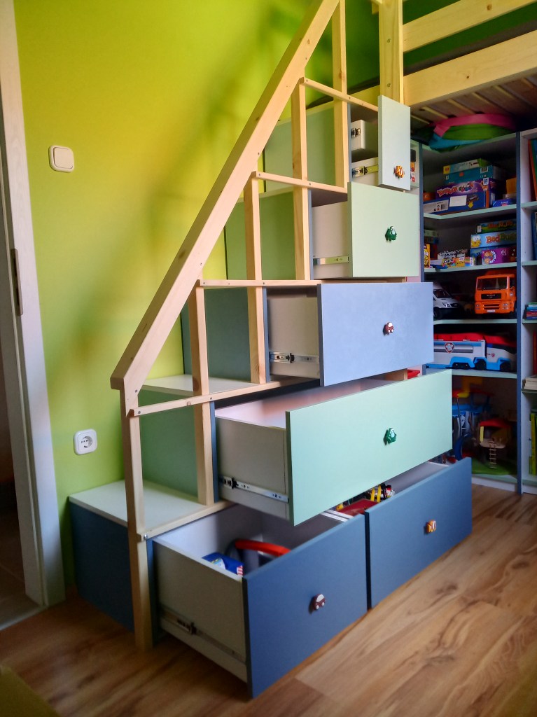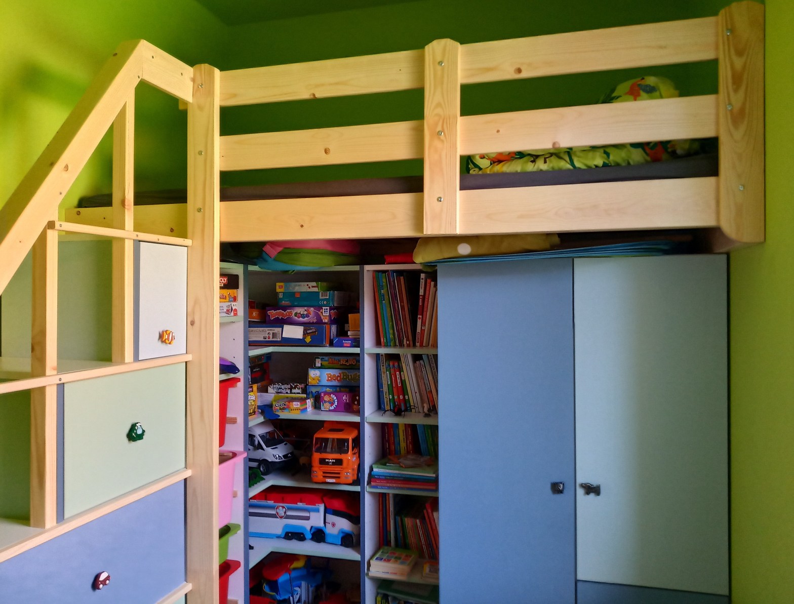 Lépcsőbe rejtett fiókok, ágy alá rejtett polcok és szekrény. A megrendelés pasztell kék és zöld kombinációjára szólt, a falon utóbb megjelent a tulajdonos kedvenc színe, az élénkzöld is.