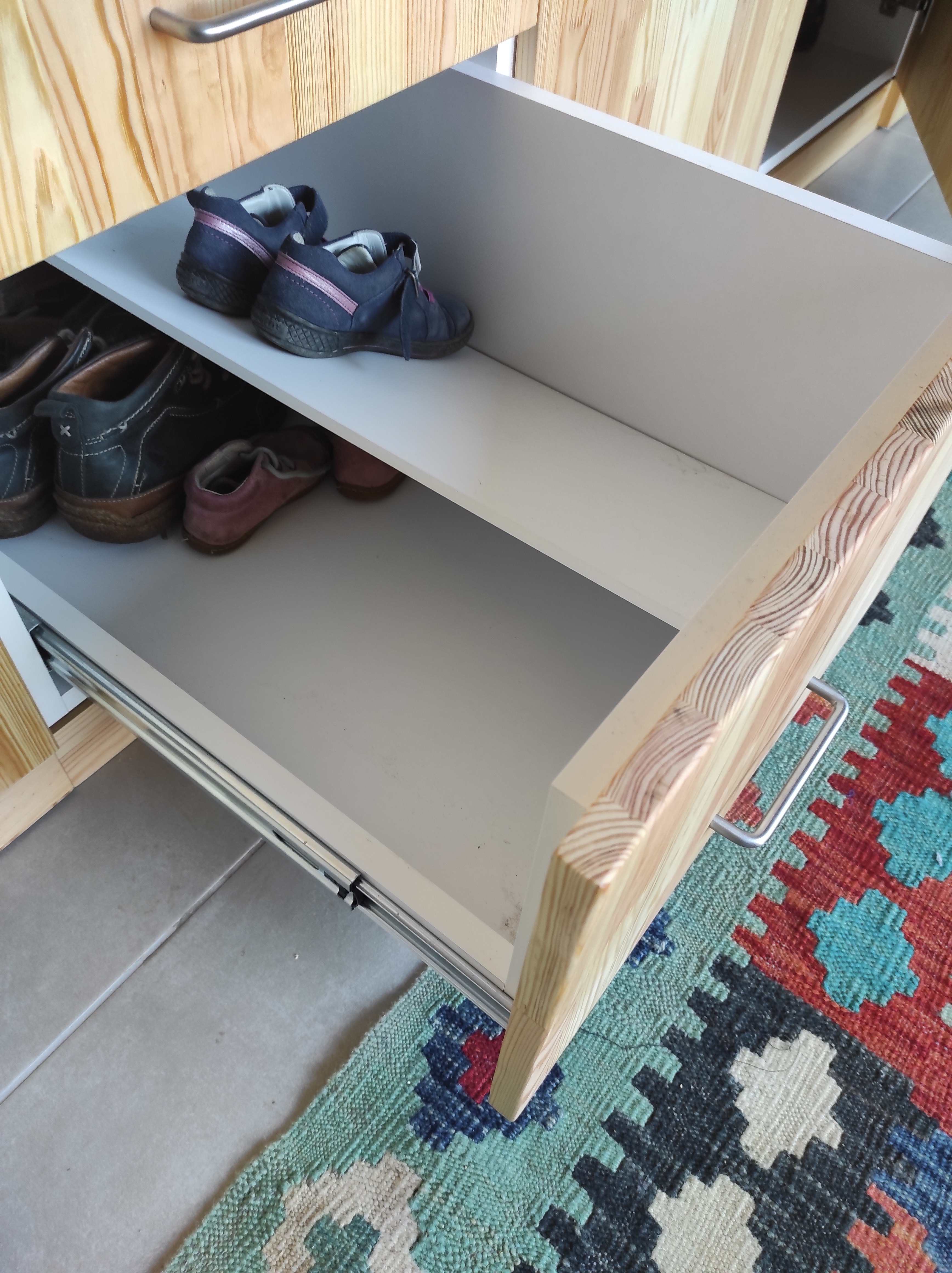 Itt is a helykihasználás volt a cél, így születtek a 83 cm mély kétszintes cipősfiókok, a hatalmas sapkásfiók, a trapéz alakú fiók plusz polca, a kabátok mögötti polcok a ritkán használt dolgoknak és a fönti háromszög alakú fiók, hogy el lehessen érni a szekrény mélyét is létra nélkül. Baloldalon az ajtó a fűtés szerelvényeit rejti, meg persze néha a gyerekeket is, akik kihasználják ezt a gyerekléptékű zugot bújócskázásra 🙂