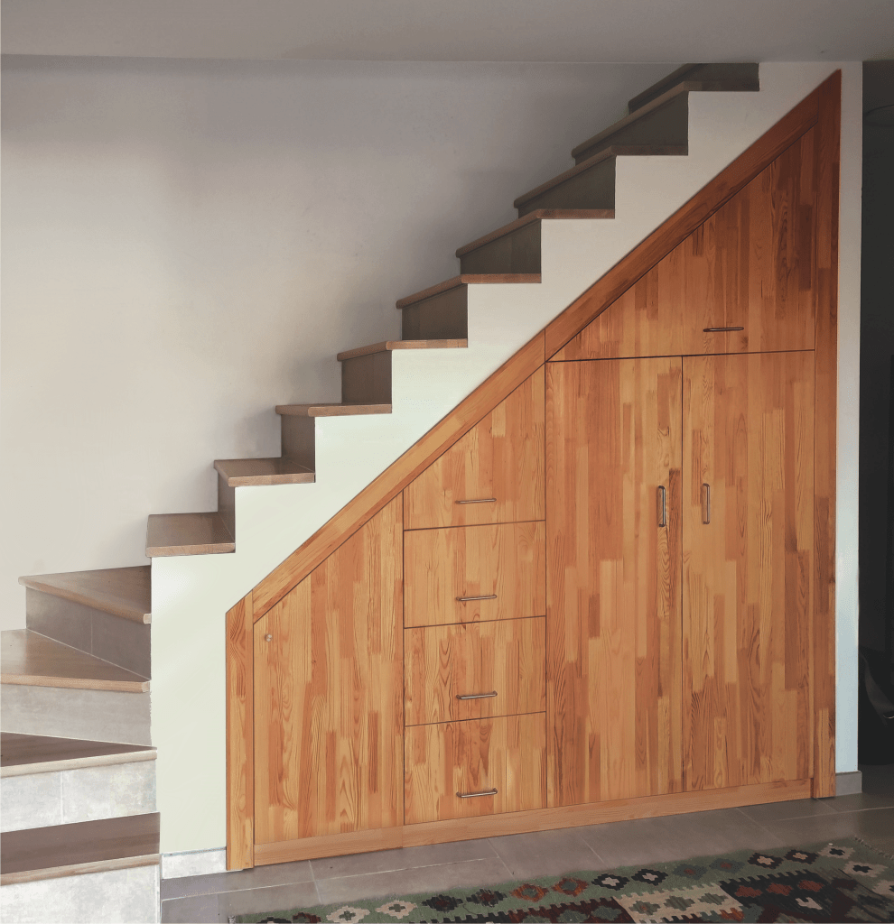 Kisgyerekes háztartásba készült a címben szereplő beépített szekrény. A szerkezet anyaga fehér bútorlap, de a frontok csomómentes, hossztoldott borovifenyőből készültek olajjal kezelve.