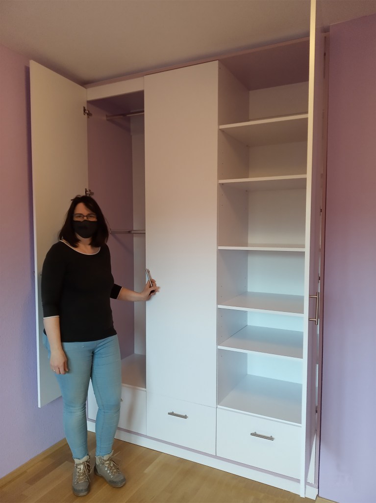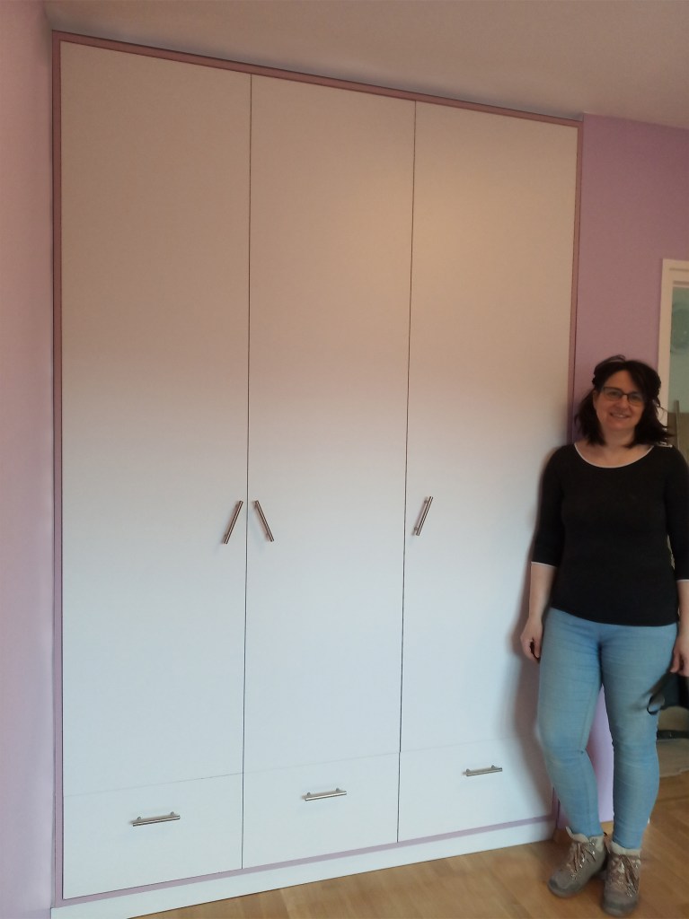 Egy pici lány szobájába készült ez a szekrény. Az oldalfalai a megrendelő kérésére olyan színűek, mint a szoba fala, az ajtajai fehérek.