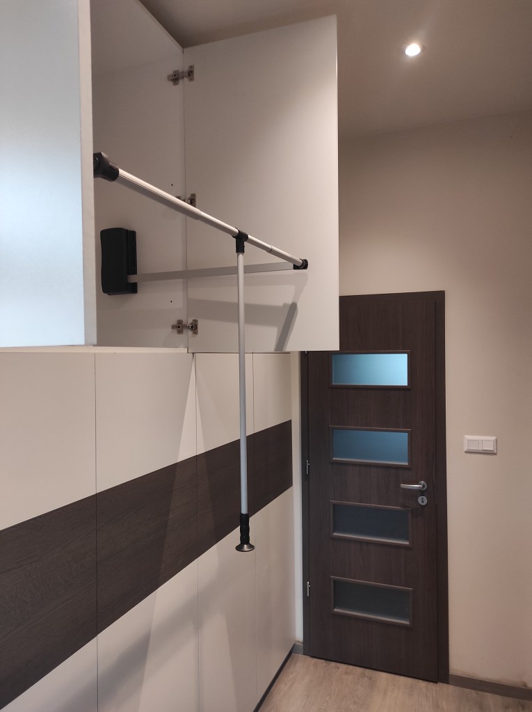 Nem látjátok? Na látjátok! Baloldalt egy szekrény, de szerintem annyira belesimul az előszobába, hogy szinte észrevétlen (kivéve, ha el akarsz rakni több köbméter ruhát). Erősen válogattuk a helyszínen, hogy melyik bútorlapok illeszkednek a legjobban az ajtókhoz, falakhoz, padlóhoz, szerintem sikerült nagyon jól passzoló lapokat választani. Polcok, vállfatartó rudak, ruhalift segítségével lehet rendszerezni hatalmas mennyiségű ruhát.