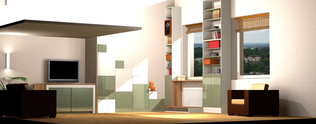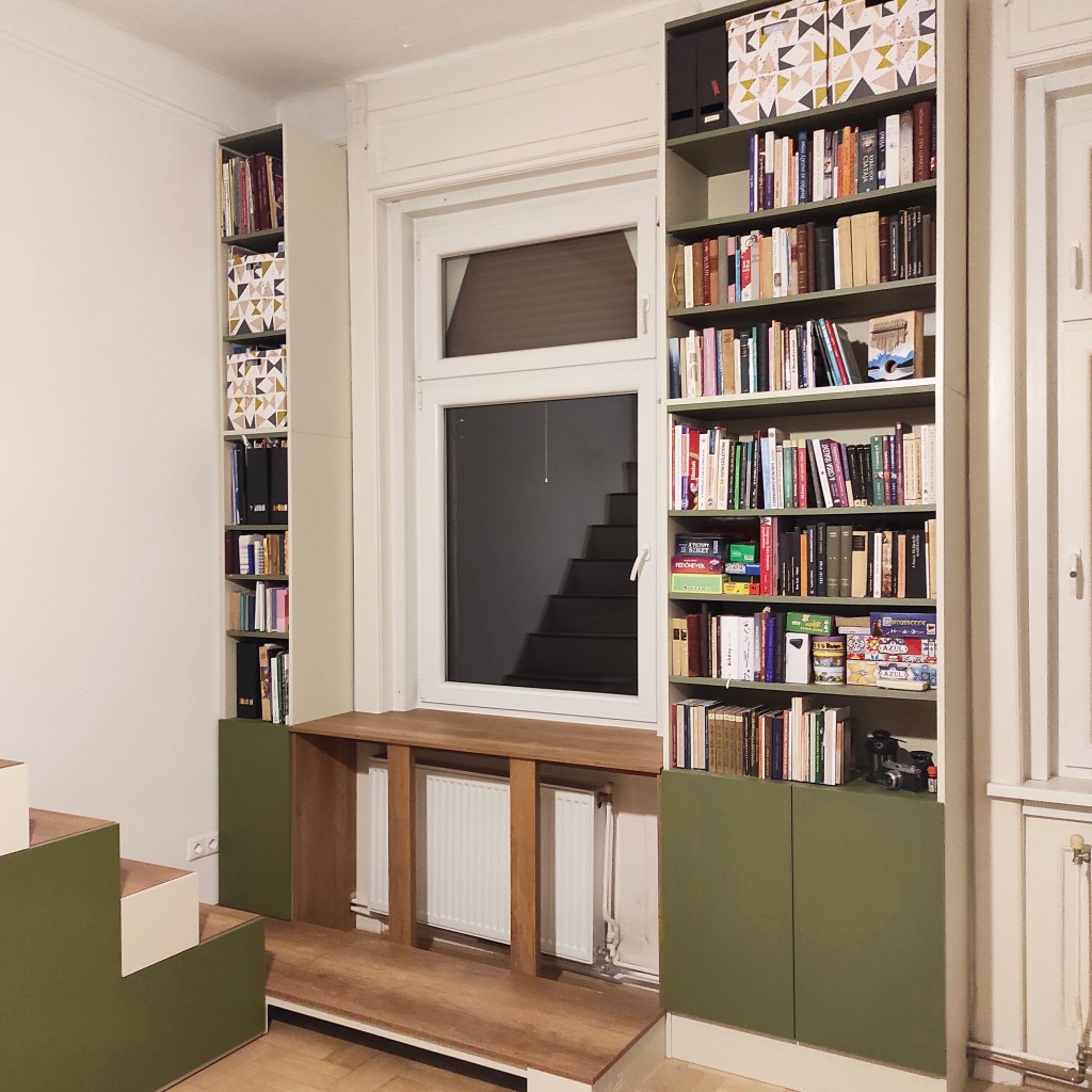 Átvitt értelemben és szó szerint is persze. Egy fiatal házaspár nappalijában a fém galériára való feljutást kellett megoldani, és ha már lépcső, legyen szekrény is, sok-sok rakodótérrel, kellett egy komód is, és ha már komód, legyen benne egy kihúzható asztal a munkához, kellett egy ülőke az ablakban, és ha már az ülőkének van dobogója, az legyen Fifi, a robotporszívó pihenőhelye. A könyvszekrényeknek nincs más funkciója, mint a könyvszekrénység.