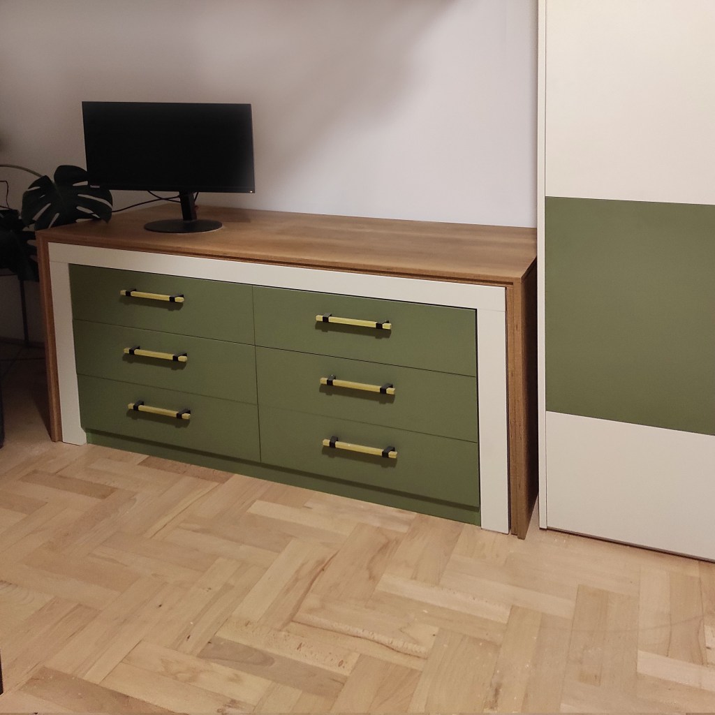 Elég konkrét elképzelésekkel kerestek meg, mind a színeket, mind a funkciókat illetően, a helyszínen a “pesto” elnevezésű színre és egy tölgyre esett a választásuk, ehhez javasoltam az ivory-t, hogy oldjuk, világosítsuk az összhatást. Az ajtók tip-on nyitást kaptak, mivel a lépcsőhöz nem passzolt volna semmilyen fogantyú, a fiókokra viszont jól illik a fekete fém és tölgy kombinációja.