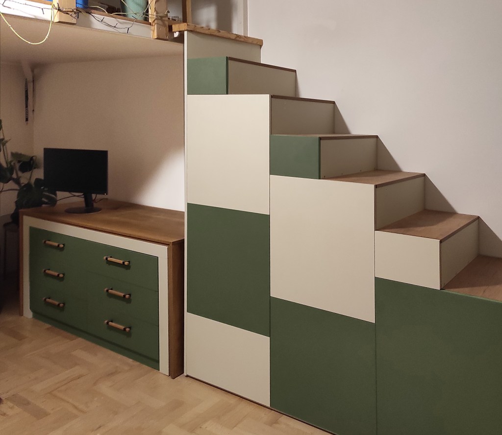 A munkát egy vidám öthónapos kislány felügyelte, aki szüleivel együtt el is foglalta a szekrényt mihelyt kész lett: kaptunk egy képet, ahogy a család három tagja a lépcső három különböző polcára kucorodott be. A felnőttek viszonylag kényelmesen beültek a 72 cm mély pakolóhelyekre, a pici pedig a maga teljes hosszában végighasalt egy polcon és onnan kukucskált ki.