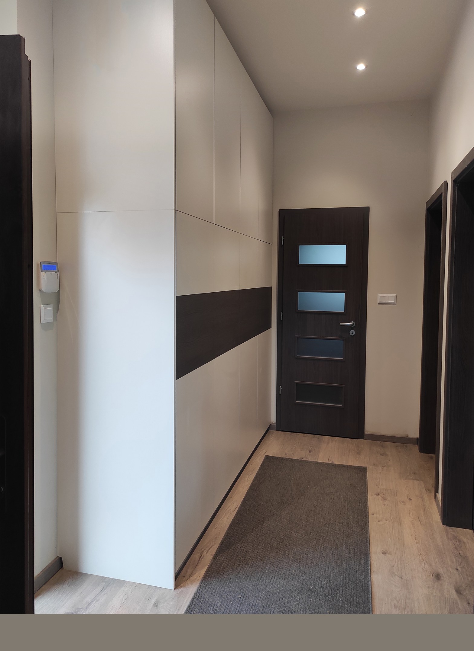 Nem látjátok? Na látjátok! Baloldalt egy szekrény, de szerintem annyira belesimul az előszobába, hogy szinte észrevétlen (kivéve, ha el akarsz rakni több köbméter ruhát). Erősen válogattuk a helyszínen, hogy melyik bútorlapok illeszkednek a legjobban az ajtókhoz, falakhoz, padlóhoz, szerintem sikerült nagyon jól passzoló lapokat választani. Polcok, vállfatartó rudak, ruhalift segítségével lehet rendszerezni hatalmas mennyiségű ruhát.