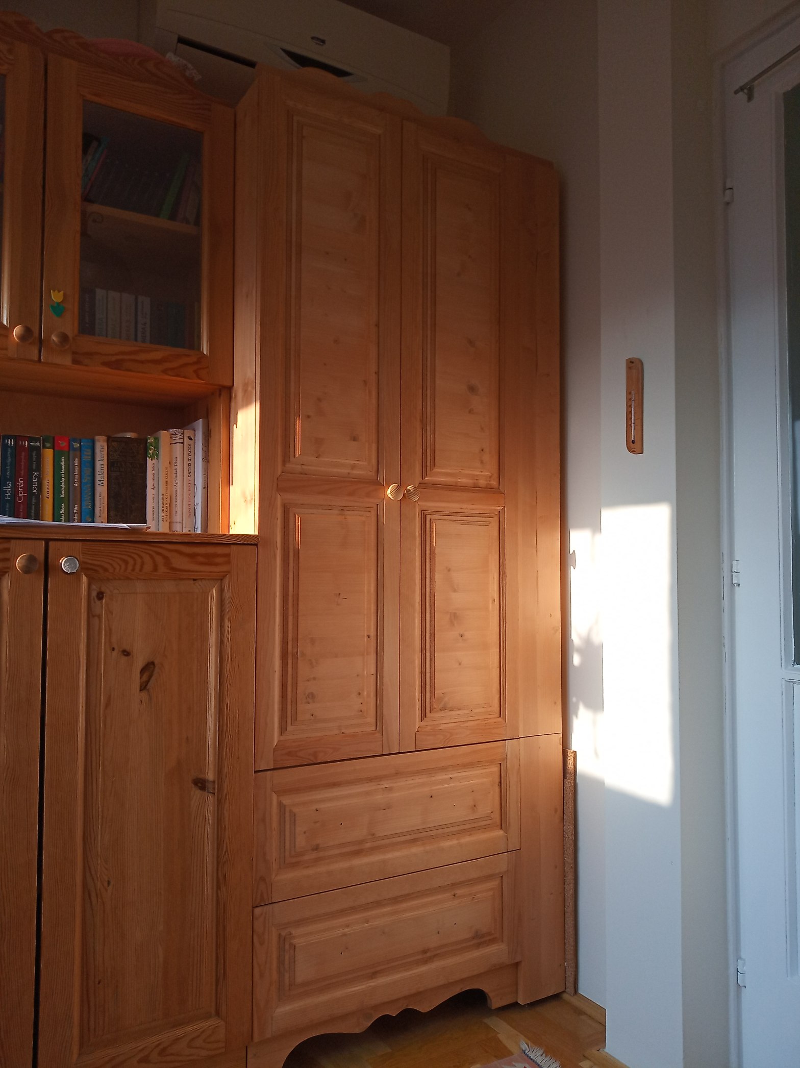 Ezt a szekrényt a baloldalon levő régi mellé készítettem, ezért a színét pácolással öregítettem a másikhoz. A jobb oldalán egy falpillér van, ezért jelenik meg a szekrényen is egy függőleges sáv az ajtó és a fiókok mellett.